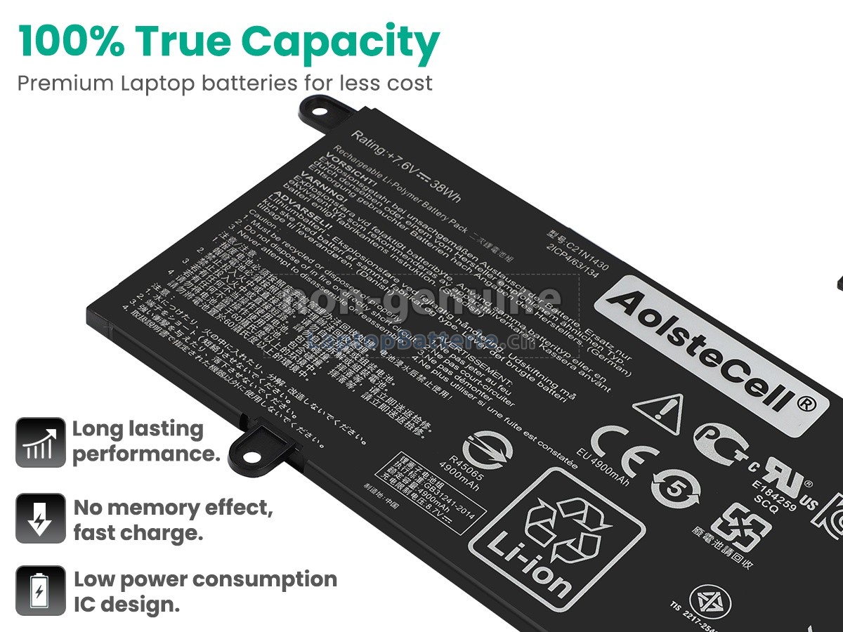Unser Website ist Ihre Quelle der hochwertigen Asus-Laptop-Batterien! Diese brandneue 38Wh (2 zelle) Asus C21N1430 Ersatz Li-Polymer-Akkus wird mit hochwertigen Zellen von Samsung, LG und Panasonic gefertigt, um die maximale Leistung zu versichern. Das Gehäuse des Asus C21N1430 Batteriepacks wird aus nicht entzündbarer und sehr robuster Plastik gefertigt, die flammgeschützt und haltbar ist, wenn sie von einer niedrigen Höhe fällt.