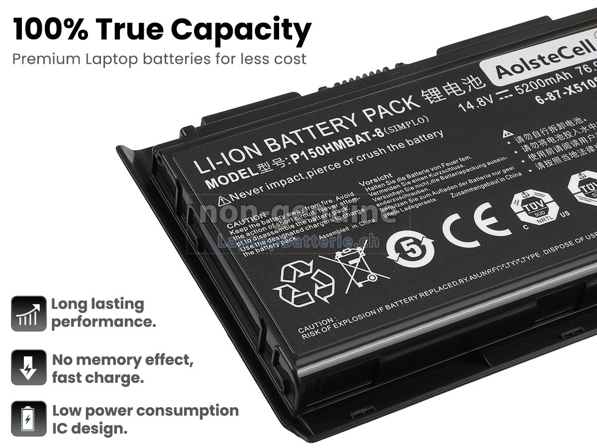 Unser Website ist Ihre Quelle der hochwertigen Clevo-Laptop-Batterien! Diese brandneue 76.96Wh (8 zelle) Clevo NP8150 Ersatz Li-ion-Akkus wird mit hochwertigen Zellen von Samsung, LG und Panasonic gefertigt, um die maximale Leistung zu versichern. Das Gehäuse des Clevo NP8150 Batteriepacks wird aus nicht entzündbarer und sehr robuster Plastik gefertigt, die flammgeschützt und haltbar ist, wenn sie von einer niedrigen Höhe fällt.