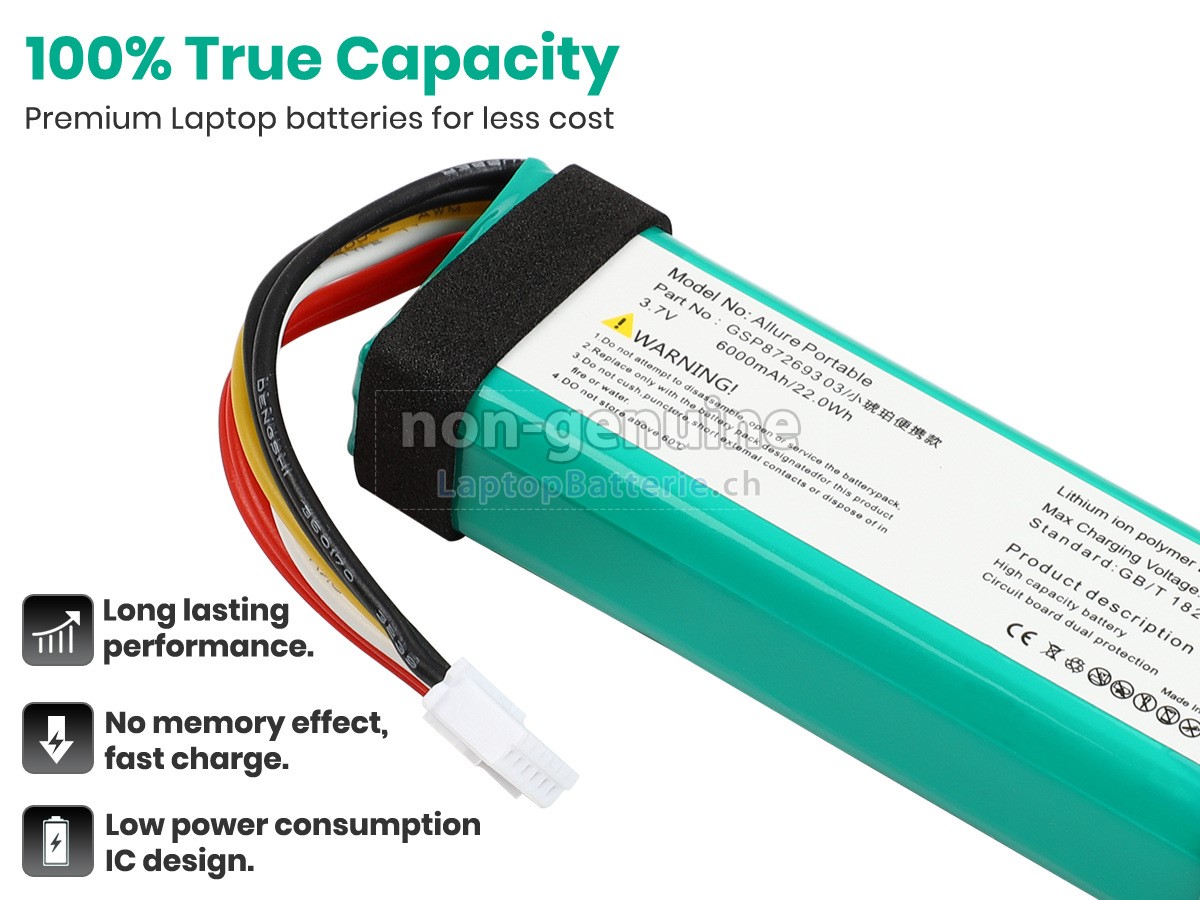 Unser Website ist Ihre Quelle der hochwertigen Harman Kardon-Lautsprecher-Batterien! Diese brandneue 22Wh (2 zelle) Harman Kardon GSP872693 03 Ersatz Li-ion-Akkus wird mit hochwertigen Zellen von Samsung, LG und Panasonic gefertigt, um die maximale Leistung zu versichern. Das Gehäuse des Harman Kardon GSP872693 03 Batteriepacks wird aus nicht entzündbarer und sehr robuster Plastik gefertigt, die flammgeschützt und haltbar ist, wenn sie von einer niedrigen Höhe fällt.