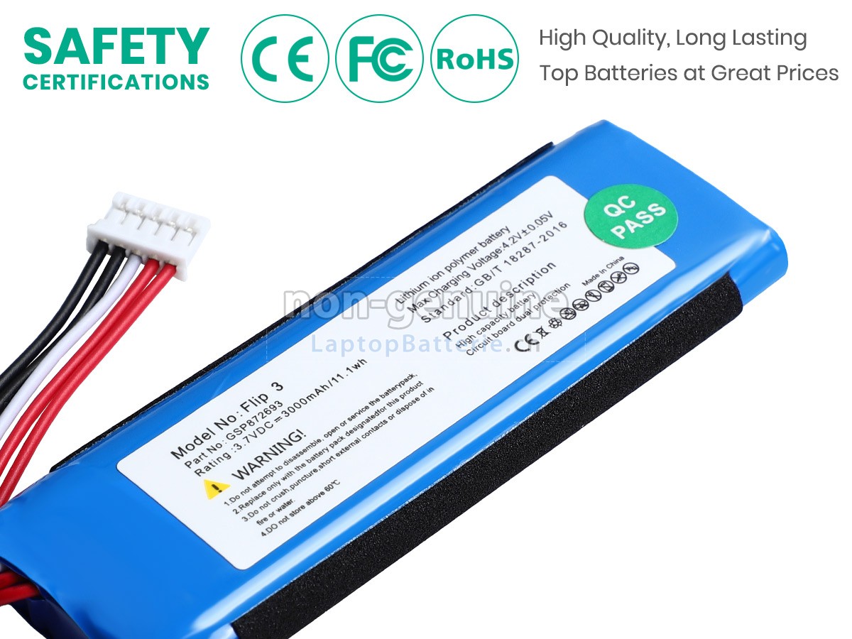 Wir nehmen die Sicherheitsanforderungen sehr ernst. Jede hochwertige Ersatzbatterie für JBL FLIP 3 PORTABLE SPEAKER Lautsprecher von uns wird getestet, um sicherzustellen, dass sie die Leistungsfähigkeit der originalen JBL-Batterie gleicht oder übertrifft und 100% kompatibel mit den originalen Herstellerspezifikationen sind. Nach Maßgabe der internationalen Standards haben sie eine Reihe von strengen Sicherheitszertifikate wie CE, UL, ROHS, ISO9001/9002 erhalten. Allgemein gesagt kann diese JBL FLIP 3 PORTABLE SPEAKER Ersatzbatterie mehr als 600 Zyklen geladen und entladen werden.