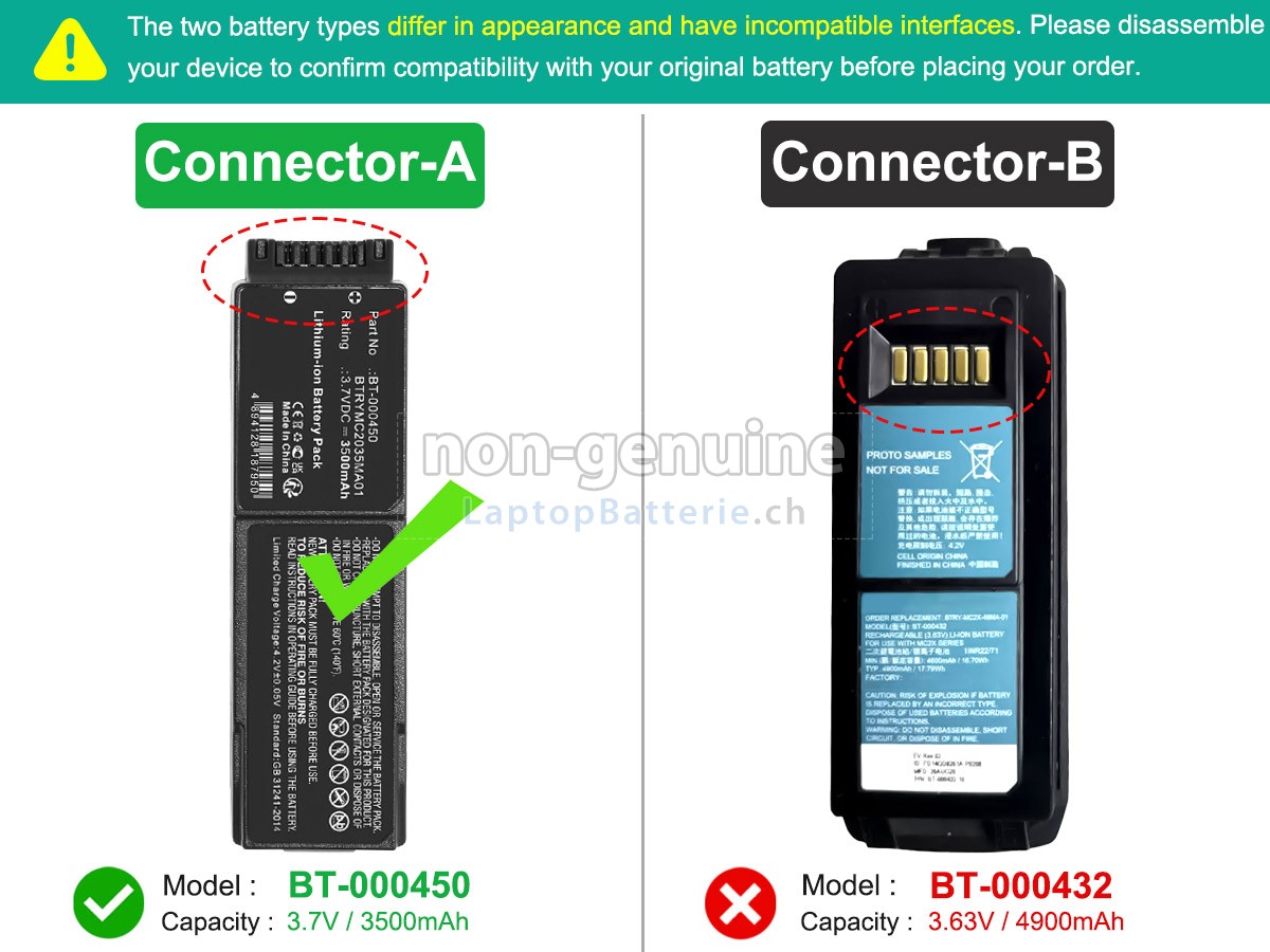 A:Zum ersten finden Sie die Teilnummer Ihrer alten Batterie oder die Modellnummer Ihres Gerät heraus (z.B „Zebra MC220J“) und dann vergleichen Sie es mit unserer Produkt-Kompatibilitätstabelle. Zweitens, bitte vergleichen Sie die alte Batterie mit unsren Produktbildern, um sicherzustellen, dass Ihre Formen gleich sind. Schließlich überprüfen Sie die Nennspannung, ob sie gleich wie die alte Batterie ist.